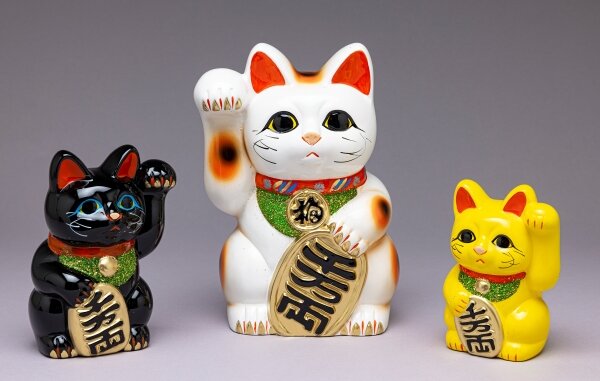 Maneki-neko; Puppenmanufaktur Baigetsu Tomimoto-Ningyoen Tokoname, Präfektur Aichi, Japan, 2025; Keramik (Ton), 16 x 11 x 10 cm (Schwarz :1); 23 x 16 x 15 cm (Weiß :2); 13 x 9 x 8 cm (Gelb :3)MARKK Inv Nrn. 2025.15:1-3, Ankauf, 2025