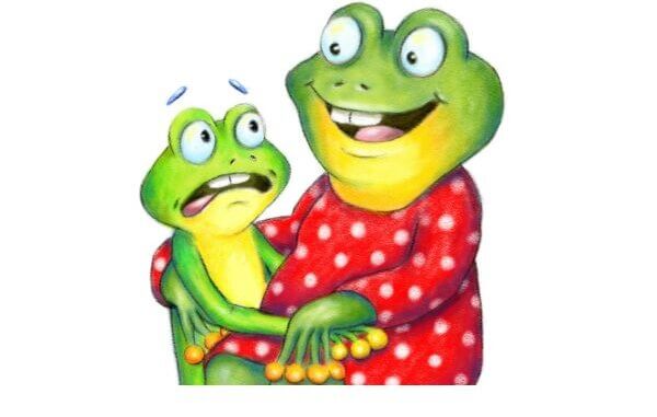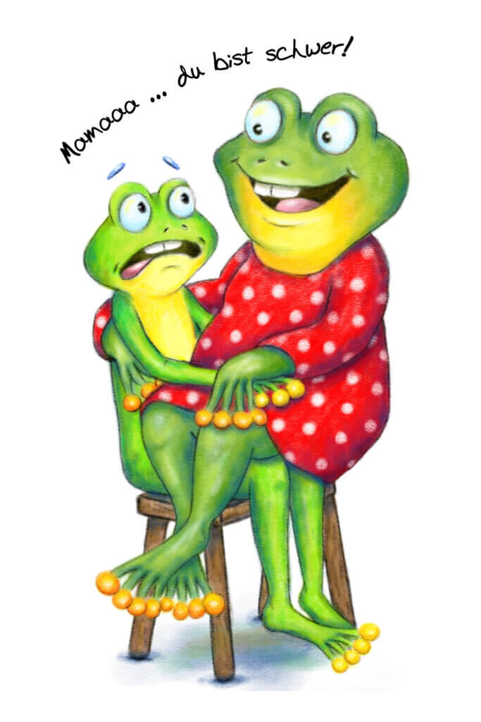 Ein humorvolles Praxisimpuls aus meinem Buch Atelier für Biografiearbeit lautet: Ich mit meiner Mutter auf dem Schoß. Zu diesem Impuls gestaltete die Künstlerin Yvonne Lautenschläger das Bild der beiden Frösche. Entstanden ist eine Szene, die auf eine berührende Weise mit vertrauten Rollenbildern spielt.