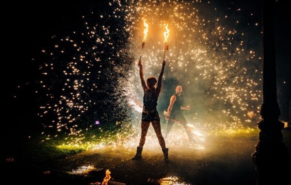 Das Flamba-Duo präsentiert eine feurige Darbietung aus Feuerartistik und Tanz. Es wird romantisch, feurig, wild, leidenschaftlich und lustig. Rasante Action und faszinierende Feuereffekte wechseln sich ab. Und das Besondere: Die Besucherinnen und Besucher erwartet eine Kombination aus LED-Lichtshow und Feuershow.