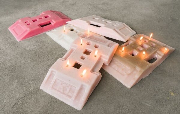 Rebekka Kronsteiners Arbeiten sind vergänglich und lösen sich mit der Zeit selbst auf. Damit entzieht sich die Künstlerin den Mechanismen eines Kunstmarktes, der auf Wertsteigerung ausgerichtet ist. Thermobeschichtetes Papier wie Bonrollen aus dem Discounter verwandelt sie mit Brennschere und Lockenstab in schwarze Zettel. Diese flicht sie zu einem großen Bild, das jedoch langsam seine Farbe verliert. Wachs und andere schmelzbare Materialien sind von ihr in Rahmen gepresst. Die Rahmen selbst sind Bildträger aus dem öffentlichen Raum, von Kronsteiner eingesammelt und verwandelt und veredelt. Auch Axel Loytved verfremdet Materialien und versetzt Alltägliches und besonders Ausgedientes und bereits Entsorgtes in den Zustand der Kunst. Dreckigen Schneematsch, von Autoreifen heruntergefallen, lässt er in Bronze gießen. Leergegessene Chipstüten durchsticht er mit einem Locher und suggeriert Besonderheit durch ihre Präsentation auf dem Ausstellungsboden.