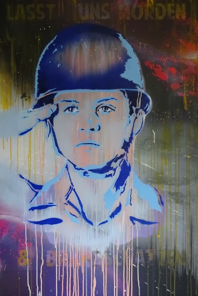 B: Da gibt es sooo viele! In der Malerei etwa Daniel Richter, Jonas Burgert, Jonathan Meese, Erro, Ena Swansea, um mal bei den Lebenden zu bleiben… Im Graffitibereich sind es neben den alten Größen wie RTA, ERIC, Moral, Candy Chintz, heutzutage Razor, Moses/Taps, Rage, Round. In der Musik: Ton Steine Scherben, Bob Marley, A Tribe called Quest, BDP, Run DMC, Miles Davis, EST, Maceo Parker, Leonard Cohen, Sex Pistols, Radiohead, Portishead, Massive Attack usw. Bei Texten sind es Astrid Lindgren, Aldous Huxley, Ellis Kaut, George Orwell, Jonathan Stroud.