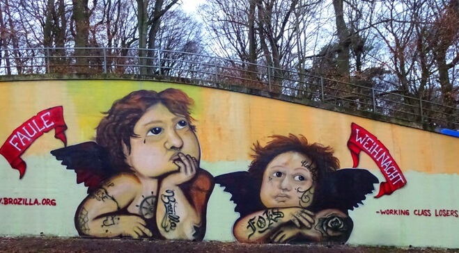 Seine Kunst ist auch in Harburg präsent und zur Weihnachtszeit schenkte er uns an der Haake die „faulen Engel“. Er ist freischaffender Künstler, passinionierter Heimfelder und 37 Jahre alt.