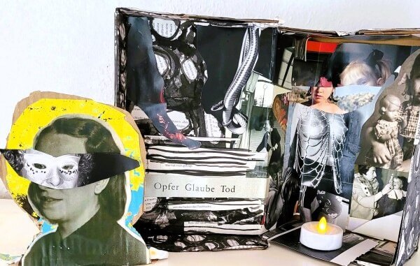 Die Kunst als Ausdrucksform hilft dir dabei. Dazu habe ich einen künstlerischen Impuls für dich. Wenn du Lust hast, dann gestalte einen Ahnenaltar. Im Header siehst du die Umsetzung eines solchen Ahnenaltars in einem Schuhkarton, den ich für meine Großmutter gemacht habe. Es ist eine dreidimensionale Collage.